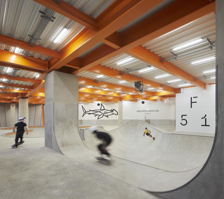 Commissioned by the Roger De Haan Charitable Trust, F51 is viewed as an important ingredient in the regeneration of Folkestone, a port town on the English Channel. The four-story concrete and mesh-covered building is located in Folkestone Creative Quarter, "an urban village of designers, filmmakers, musicians, web developers and artists" housed in nearly 100 restored buildings. The completion of the skatepark comes one year after skateboarding joined the Olympic Games and two years before it will be held again, just across the Channel as part of Paris 2024. Olympic dreams aside, F51 is intended to "offer young locals freedom and the opportunity to push both physical and mental boundaries within a safe space away from screens," per a statement from Hollaway Studio.