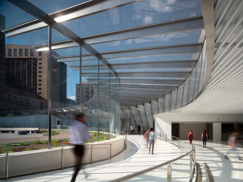 Designed by James Carpenter Design Associates and Cooper Robertson with Trivers Associates, the new Museum at Gateway Arch is bermed into the landscape and oriented westward to Downtown St. Louis. A new, block-wide landscaped bridge over the Interstate-44 trench links the entry and larger Arch landscape to Downtown.