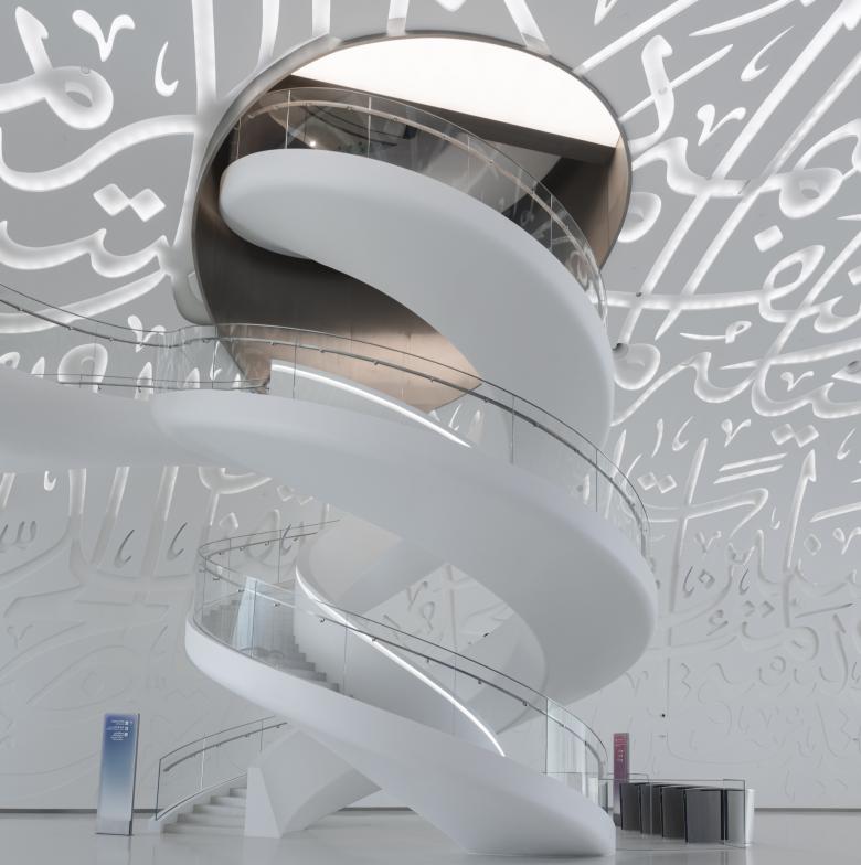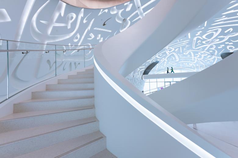 The asymmetrical torus-shaped building is striking for its form but also its skin: 1,024 stainless steel panels featuring calligraphic cutouts spelling out forward-thinking quotes in Arabic by His Highness Sheikh Mohammed Bin Rashid Al Maktoum. The facade was a canvas for artist Mattar bin Lahej, while the building itself was designed by Dubai's Killa Design with engineering by Buro Happold. The building is a readymade icon in a city that has no shortage of them.
