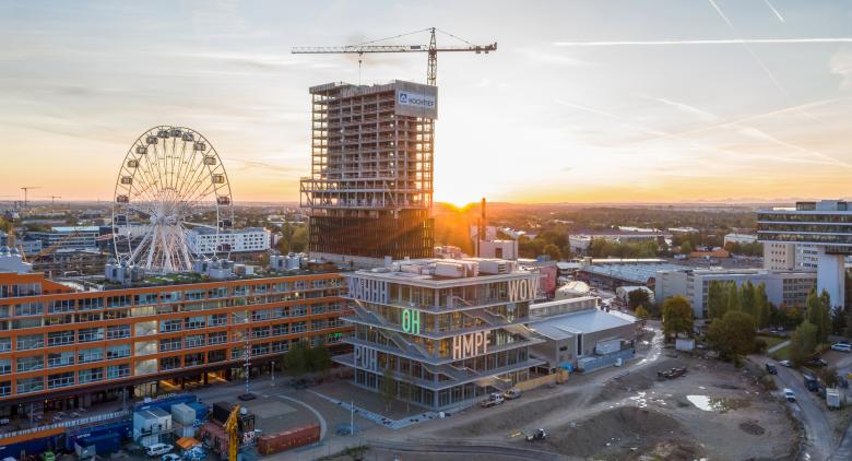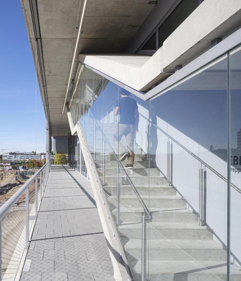"WERK12 and its forecourt form a nucleus for the Werksviertel district. The future-oriented building enables flexible uses — for work, pleasure, and recreation. The bright interior spaces, with a height of over five meters, allow for additional intermediate floors, thanks to the placement of the circulation structure on the exterior." – Andrea Jürges
