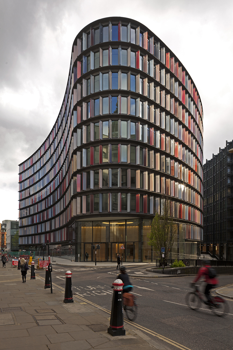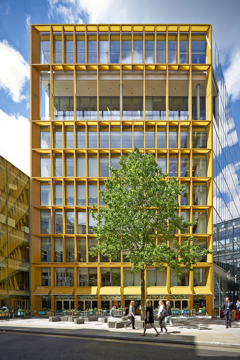 Fletcher Priest’s One New Ludgate features facades in white and yellow, two volumes that step down toward the street, and a plan that reintroduces a subtle curve to better frame a view of St. Paul's to the east. Fletcher Priest served as executive architect for Sauerbruch Hutton's Two New Ludgate, which is covered in movable glass louvers that exhibit the firm's signature polychromatic compositions. Ground-floor restaurants spill over into the small trapezoidal, south-facing plaza that occurs where the two buildings face each other (visible in top photo).