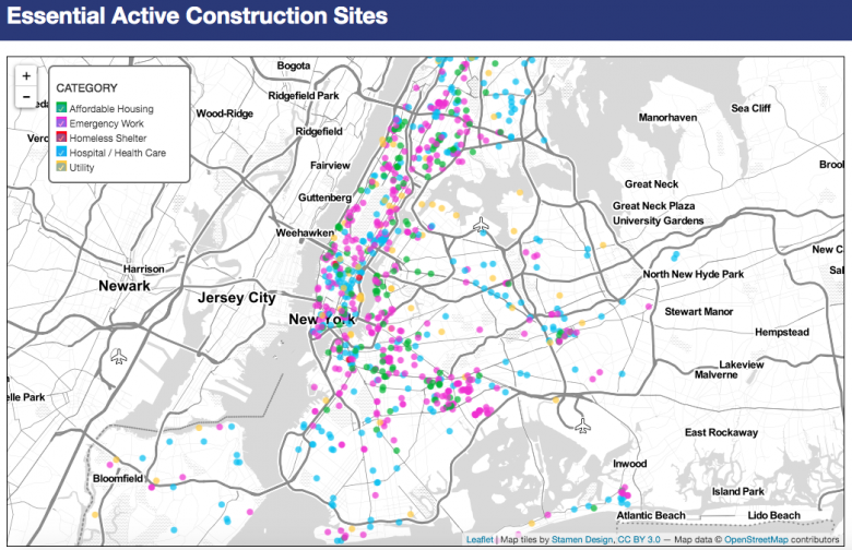 A March 30 letter from the NYC Department of Buildings (PDF link) to "owners and contractors" spells out which construction is considered essential (roads, bridges, transit facilities, utilities, hospitals or health care facilities, affordable housing, and homeless shelters) while also indicating the protective measures (maintaining social distance, mainly) that they must follow beyond standard practices.