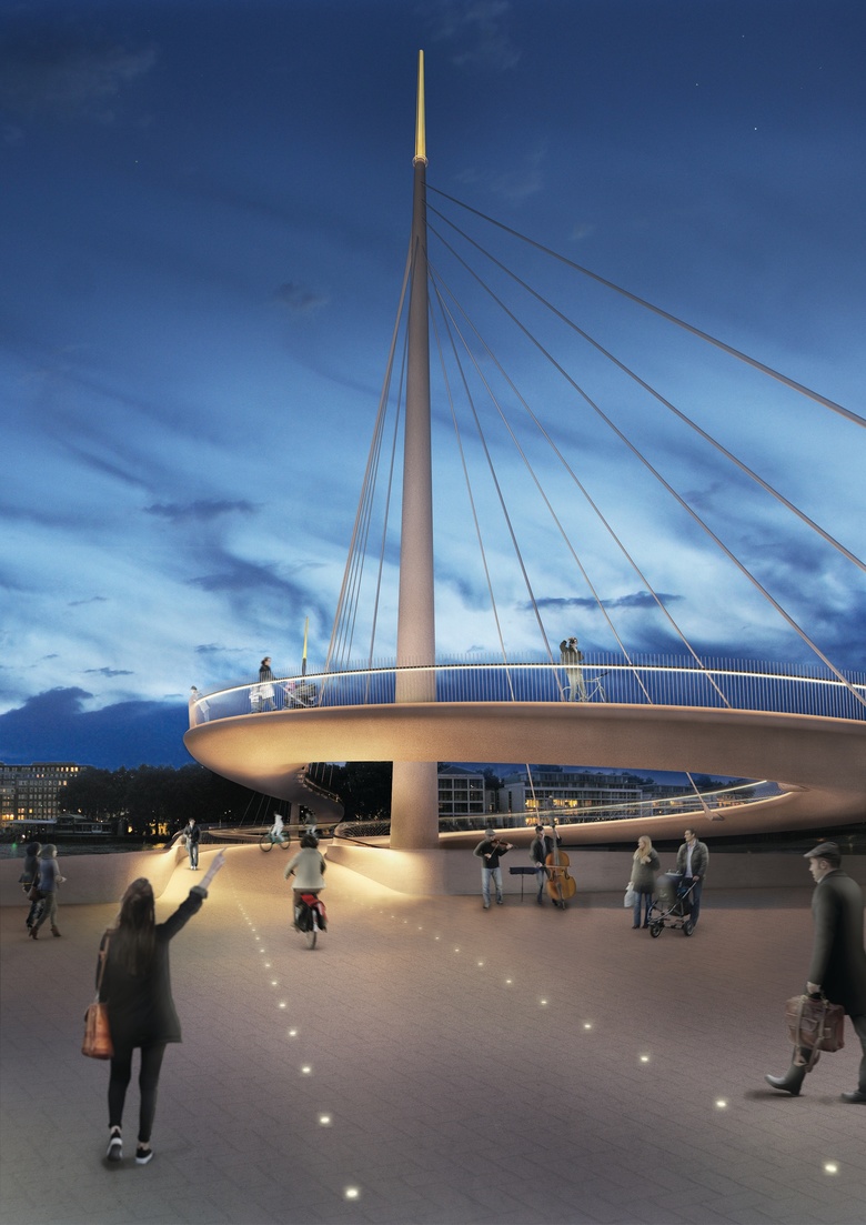 Working with Robin Snell & Partners, Sven Ole Hansen ApS, Aarsleff and ÅF Lighting on the design, Bystrup's über-minimal bridge is made up of a thin deck and swirling ramps suspended from two tapered shafts with gilded tops. The simple design is meant to minimize the footprint of the bridge on the north and south sides of the Thames, in part to address opponents of the project.