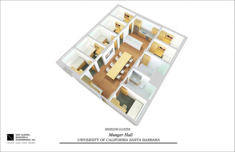 Each "bedroom cluster" has eight single-room dorm rooms, bathrooms, kitchen, and a dining area.