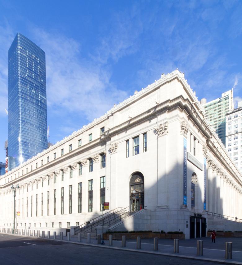 Looking at the Moynihan Train Hall from the intersection of 31st Street and Eighth Avenue, with one of the towers of the Manhattan West development looming in the distance. (Photo: John Hill/World-Architects)