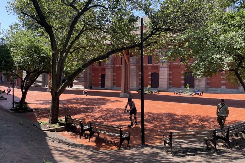 Previously known as the Brooklyn Banks, a newly “revitalized” The Arches opened to the public in early June, fifteen years after the leftover space used by skateboarders at the base of the Manhattan side of the Brooklyn Bridge was closed. The brick-paved space takes its current name from the distinctive stone arches supporting the bridge anchorage, while the old, informal name refers to the design of the space in the 1970s by landscape architect M. Paul Friedberg, in which sloped banks inadvertently made the space popular with skateboarders. Closed intermittently in the early 2000s, and then used as a staging area for work on restoring the Brooklyn Bridge from 2010 onwards, a group of skateboarders lobbied the city to protect the space and bring it back to its 70s-era design following the destruction of portions of the sloped banks. A section of The Arches opened in 2023, with the rest opening in early June, when Mayor Adams promised $50 Million for the further revitalization of the “forgotten spaces” beneath the Brooklyn Bridge, per a plan developed with nonprofit Gotham Park.