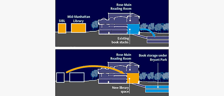 Books and other materials for the newly designed space would be moved from the Mid-Manhattan Library catercorner to the Schwarzman Building and the Science, Industry and Business Library (SIBL), designed by Charles Gwathmey. The NYPL asserts that the Mid-Manhattan branch is "heavily used but seriously deteriorating," yet the SIBL is less than 20 years old.