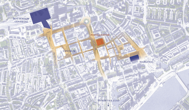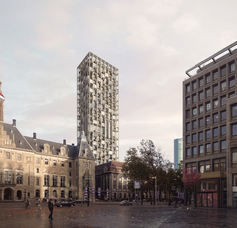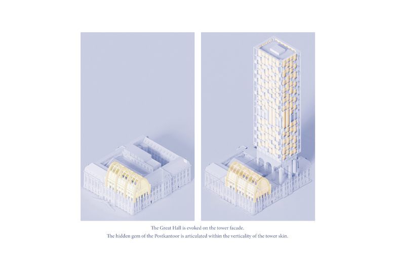 The Postkantoor, one of the few surviving buildings in Rotterdam from before World War II, will be preserved and adapted as a hotel, punctuated by the old post office's Great Hall. The tower, on the other hand, will sit atop an existing courtyard but be raised to provide a generous public space. Residences will occupy the tower, whose modern facade rhythmically echoes the exterior of the Postkantoor.