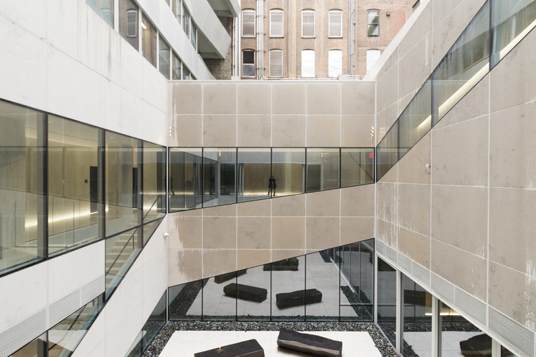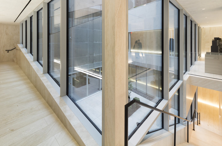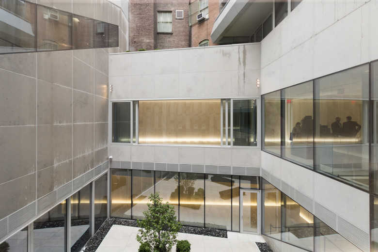 A decade later, after a number of retail and other interiors projects (including the recent Sotheby's renovation), OMA finally completed its first new building on the island of Manhattan, one block east of its failed 23 East 22nd Street. Designed by OMA partner Shohei Shigematsu for developer Toll Brothers City Living, 121 East 22nd Street is actually comprised of two residential towers (the taller north tower on 23rd Street and the shorter south tower on 22nd Street, where the lobby is located) linked by three levels of common spaces that ring a central courtyard, what the architects call "the valley."