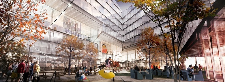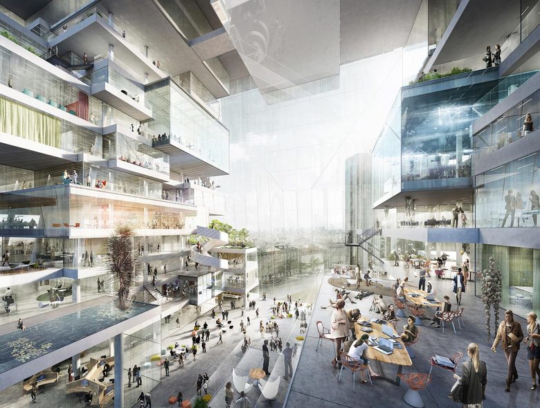 Koolhaas's scheme is focused about a large atrium – 30 meters high – that is oriented toward the existing Axel Springer building on Zimmerstrasse, a street that previously separated East and West Berlin. A plan of interconnected terraces and public workspaces creates an environment that enables both individual and collaborative work. Jury president Prof. Dr. Friedrich von Borries praised how the scheme "opens up a completely new working and communication landscape to its future users."