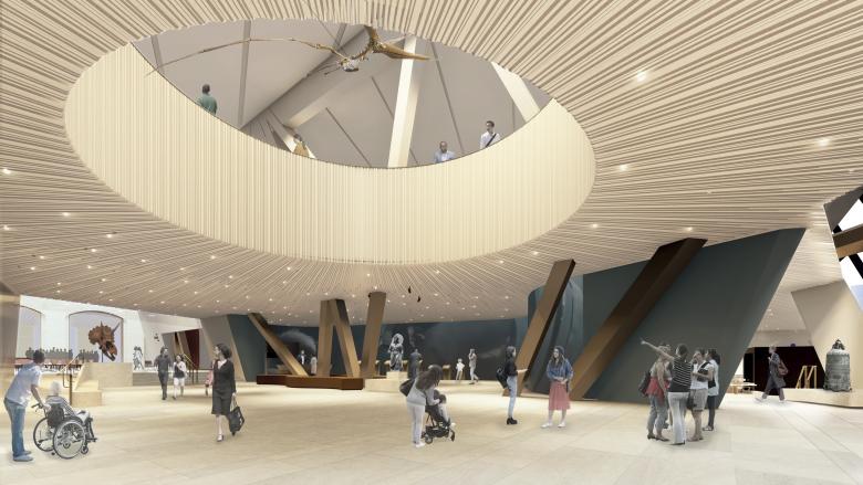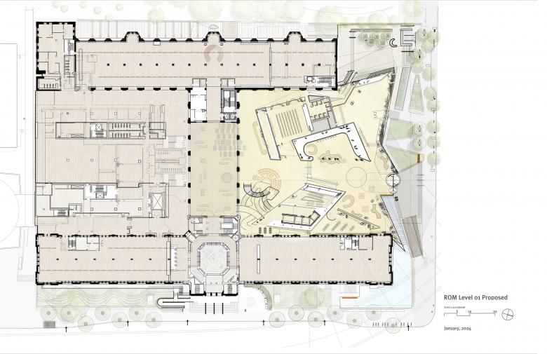 Josh Basseches, ROM director and CEO, says in a statement that the transformation by Hariri Pontarini Architects “is an opportunity to truly throw the doors of the museum open, both literally and figuratively, and invite more people in to experience all ROM has to offer.” That literal opening of doors can be grasped when comparing the outside of Daniel Libeskind's Michael Lee-Chin Crystal from 2007 (above) with Hariri Pontarini's design (below): In the latter, more glass is introduced at sidewalk level, a new fountain wraps the corner, the main entrance is reconfigured, and a new bronze canopy reaches toward Bloor Street to invite visitors inside. Architect Siamak Hariri reiterates the museum's intent in his statement: “We’re going to re-introduce ROM to Toronto with a design that, in effect, turns the museum inside out and dissolves boundaries between the public realm and the interior.”