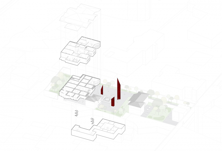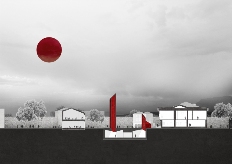The location of the Besa Museum in Tirana, as chosen by the Ministry of Culture of Albania, is at the historical Toptani Residence, meaning the project involves preservation as well as new construction. “We want to leverage the power of the existing house,” Huessler said, “having it as a site of exhibits and an exhibit itself.” Restoration of rooms within the residence will serve to “highlight historical and current events during which Besa has guided Albania,” per the architects, including the country's welcoming of Jews during the Holocaust and, more recently, refugees from Kosovo and Afghanistan. The restored residence will comprise the above-ground half of the museum, with the other half underground, beneath a plaza punctuated by Luis Barragan-esque red monoliths that the architects want “to draw visitors in from the surrounding city.”