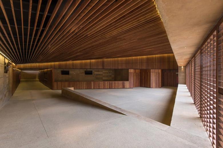 ​The building sits opposite the archeological zone of Teopanzolco in the Mexican state of Morelos. The architects' two-fold strategy was to "enhance the relationship with the archeological site" and "generate a significant public space," per PRODUCTORA's website. A stepped platform atop the triangular building addresses these by creating a generous public space that doubles as an outdoor auditorium and has views toward the archeological zone. The platform is the roof of the indoor auditorium, while a smaller platform facing the opposite direction caps the lobby.