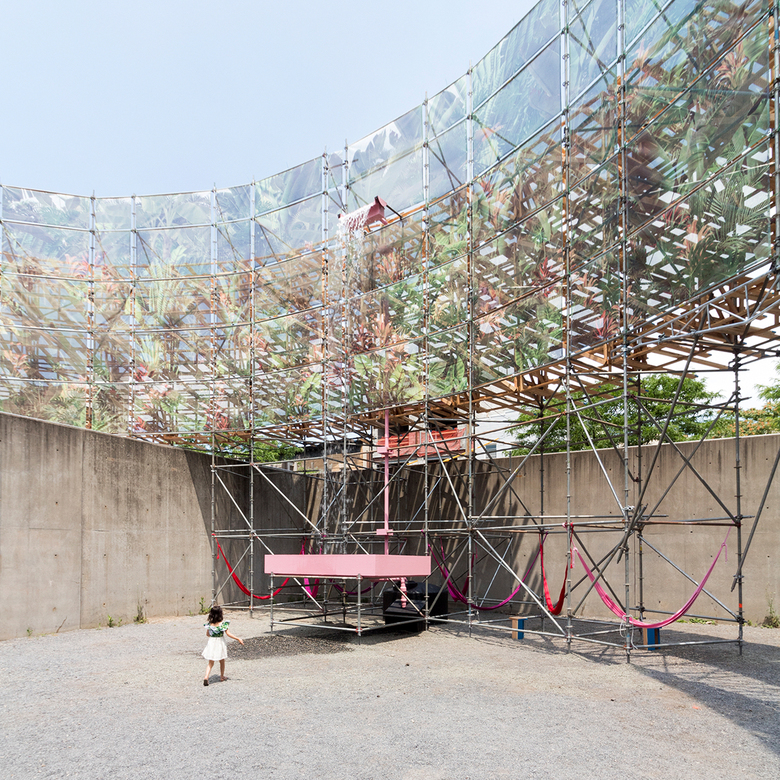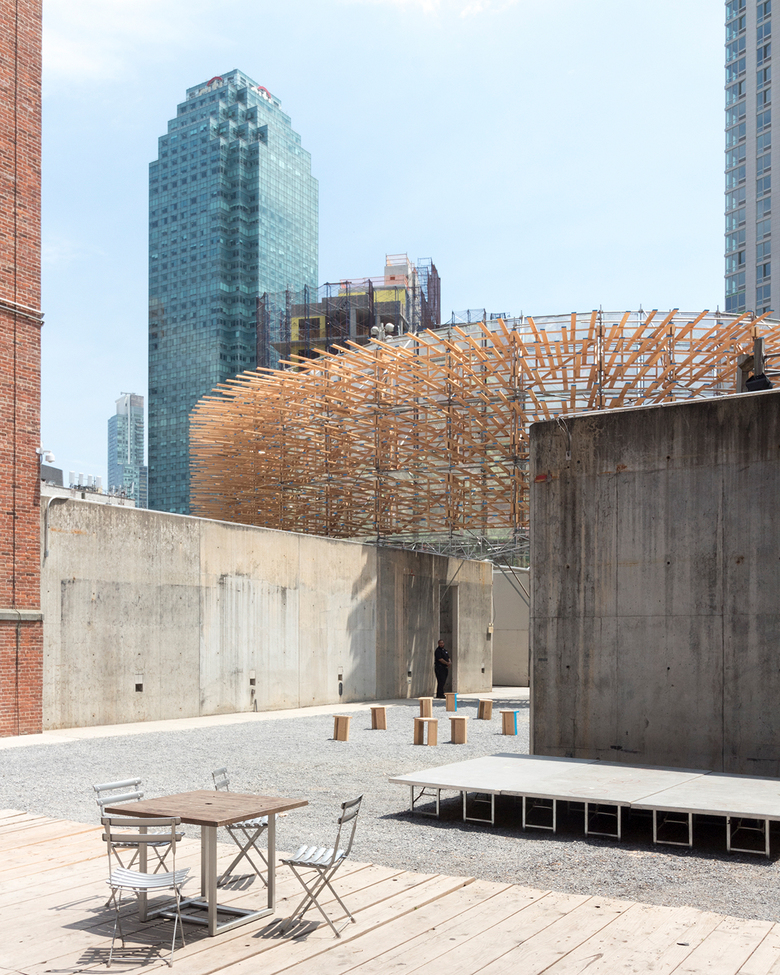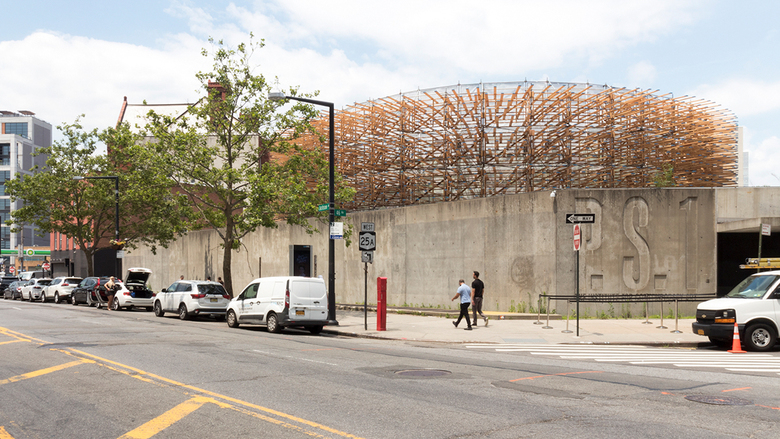 Hórama Rama has a strong presence above the concrete walls of the MoMA PS1 courtyard.