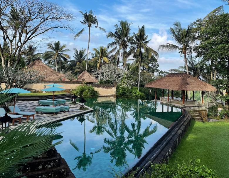 Pool and music pavilion at Amandari Hotel, Bali, 1990 (Photo: Raymondeuro/Wikimedia Commons/CC BY-SA 4.0)