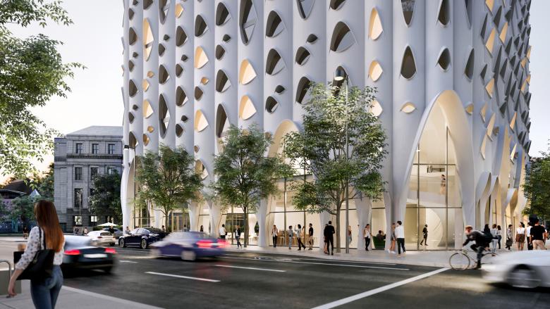 Setting aside the development's ambitious if questionable aim of becoming a "milestone of sustainable travel," the design by Studio Gang is clearly doing its part to become "an architectural landmark" in downtown Denver. Inspired by the Aspen trees native to Colorado, the building features windows that recall the trees' "Aspen eyes." Openings of different sizes and shapes give variety to the facades and subtly express the different programs within, while "lids" extend over the windows to shade the hotel rooms. The windows are set into fluted surfaces that give the three-sided building a distinctive texture.