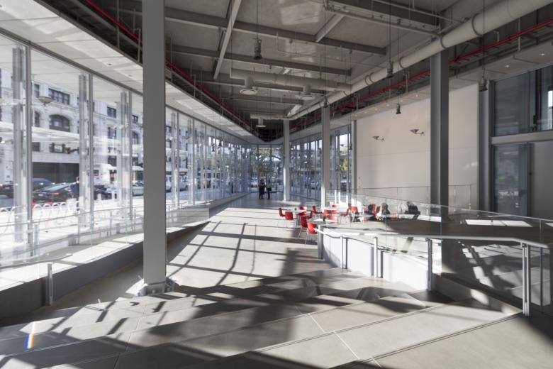 As in all the buildings completed or in the works for the Manhattanville campus, the highly transparent ground floor of The Forum is given over to public uses, such as a cafe and an information center. Here we see the tapered space on the ground floor.