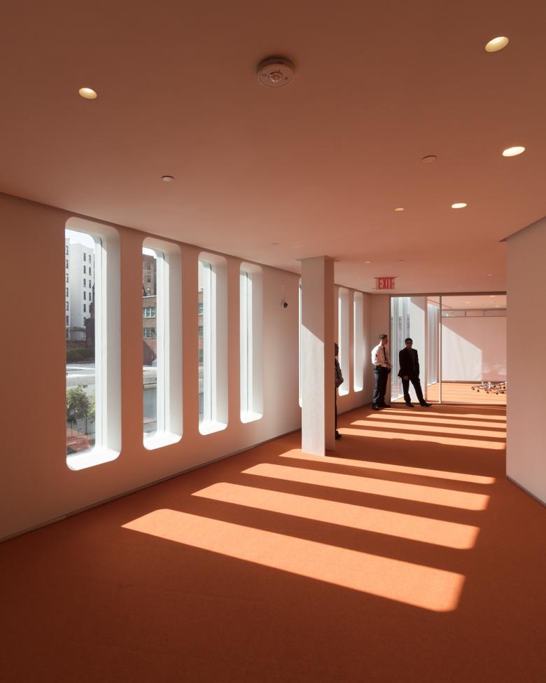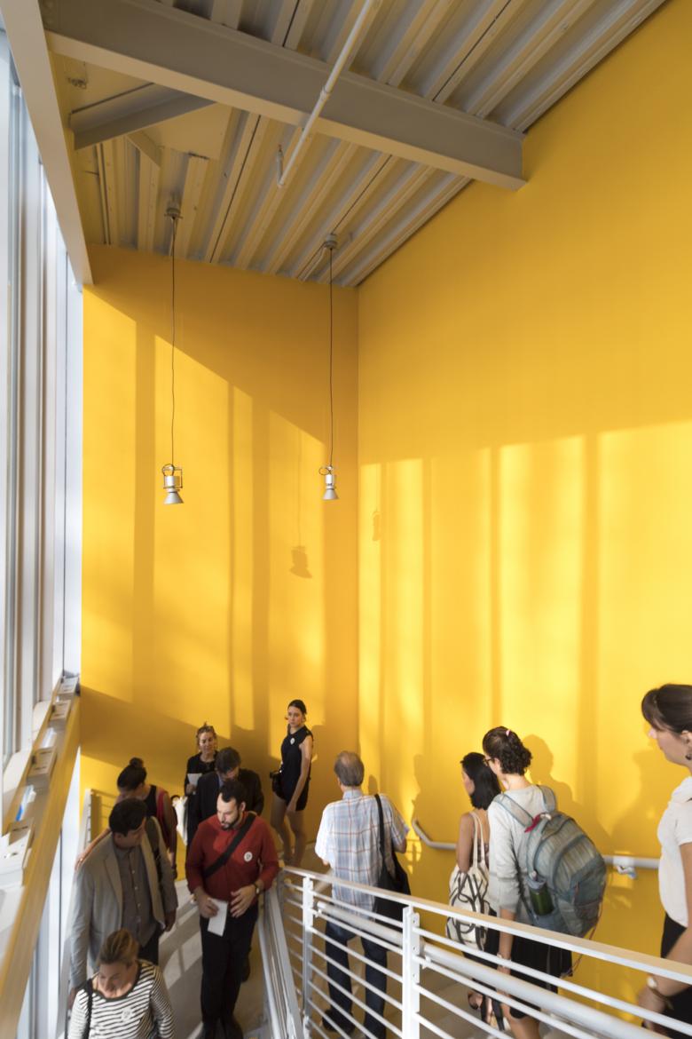 Both stairs and elevators sit behind glass walls facing Greene. Accordingly, Piano treated each with color: elevators are red while stairs are yellow. Although the latter are utilitarian, the bright colors and daylight make them more inviting than the elevators.