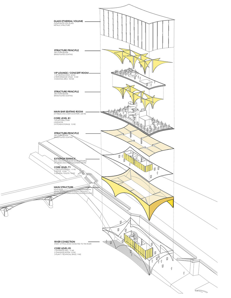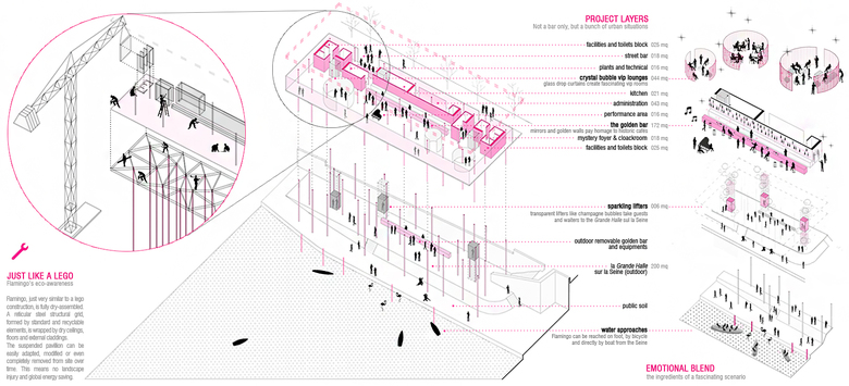 The competition brief, which launched in March 2014, asked participants to "design a Champagne Bar along the Paris river 'Seine' and by the romantic 'Pont des Arts'." Located on the Right Bank near the Louvre, the competition aimed to achieve four points: