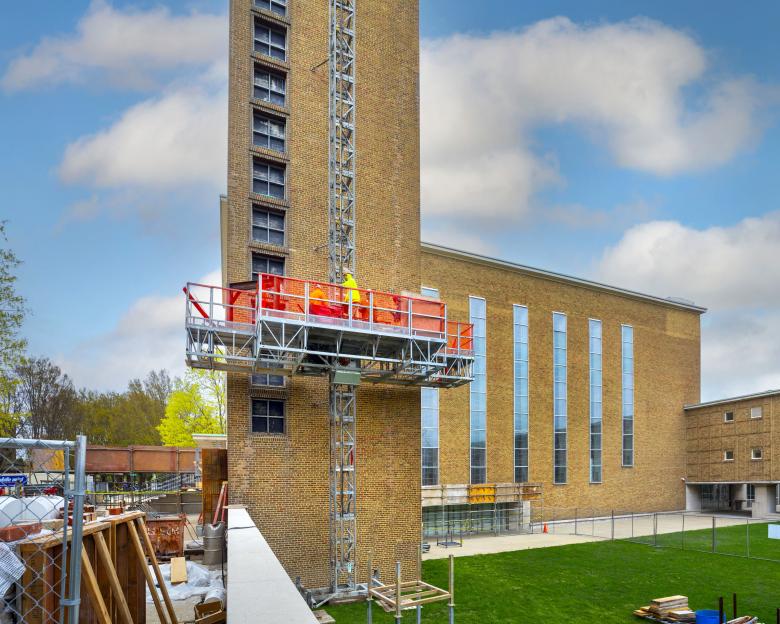 Restoration work is underway on the 165-foot-tall brick tower of Eliel Saarinen's First Christian Church, one of seven designated national historic landmarks in the small Indiana town of Columbus.