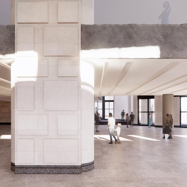 Relocated Venturi Scott Brown designed Egyptian Columns at the ground floor Shop. (Visualization © Selldorf Architects)