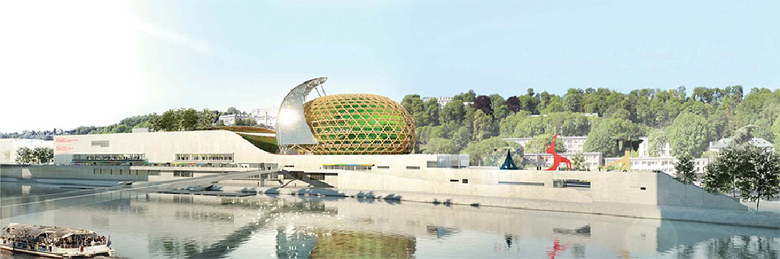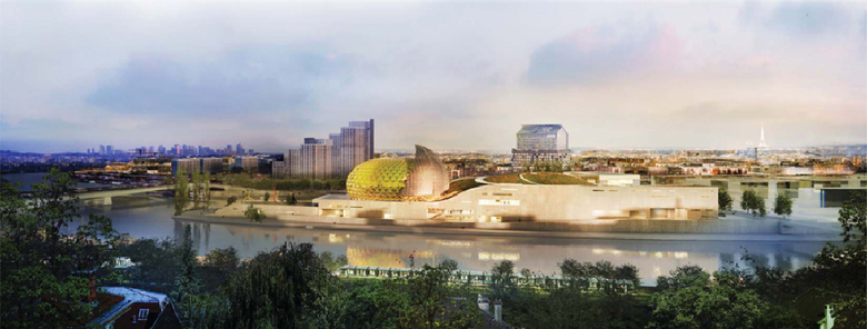 As described by Shigeru Ban's office, "In June 2010 a new private finance initiative to develop the island via a public-private partnership was announced. The Cité Musicale is one part of that initiative, envisioned as a monumental structure that will serve as the symbolic western gate to Paris." The 36,500 square meter (393,000 square feet) project consists of multipurpose concert hall (4500/6000 seats), classical music hall (1150 seats), rehearsal and recording rooms, facilities for the Paris Opera Ballet Music School, a restaurant and shop, housing for orchestra members. and a park. Completion is planned for mid-2016.