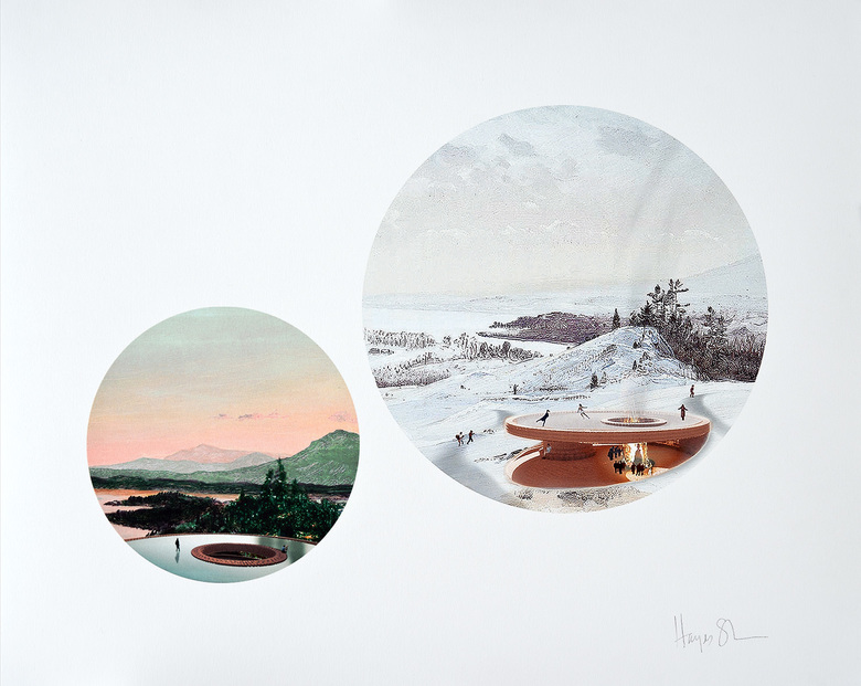 Architect Steven Holl, with one of his signature watercolors, envisions a temporary construction of scaffolding and fabric skin that lifts people above the trees to take in views of Olana's lake and the Hudson River. Although a significant departure from the style of Olana, the design's lightweight kit of parts would be easily buildable – and demountable – meaning its mark on the landscape would be minimal. The design by Hayes Slade (with James Slade and Matt Fisher) of New York's Slade Architecture, on the other hand, is deeply integrated into the site. The two-layer, circular design berms partially in the landscape to provide a pool in the summer and a skating rink with hearth in the winter. Slade's beautiful presentation accentuates the design's features while embodying the essence of Church's landscape paintings.