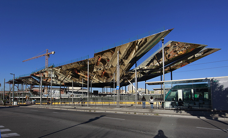 The interior space is a city precinct, a roofed square with two orthogonal axes, intensely connected to the exterior, the district and its streets. The generous entrance foyer opens onto Calle Mallorca, and the walls are dynamic, integrating public transport stops at street level.