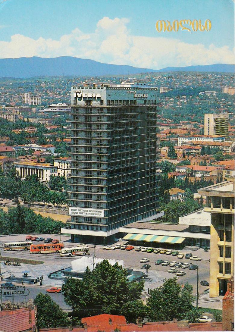 The Hotel Iveria in the heart of Tbilisi, built in 1967, is an icon of modern architecture in Georgia. The tallest building in the city when it was completed, the 20-story hotel had a blue-green stone facade, a novelty at the time. Situated on a plateau above the Kura River, it added an urban ensemble along Rustaveli Avenue and near the old city.
