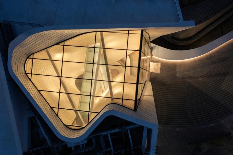 The 53,000-square-foot museum contains 25,000 square feet of reconfigurable gallery space that will be used to display some of OCMA's 4,500-piece collection of primarily 20th- and 21st-century art as well as to organize special exhibitions. In addition to the galleries, the museum has a performance and education hall, administrative offices, gift shop, café, a grand stair, and a roof terrace for exhibitions and events. Ground-level stadium seating and a generous plaza connects OCMA to the rest of the Segerstrom Center for the Arts, which is comprised of various performing arts venues.