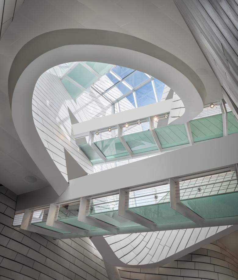 As revealed by the early photographs of the museum shown here, a lot of design attention was focused on the entry atrium, which is illuminated by natural light through a glazed wall and skylight, and is bridged at three levels to connect the different spaces of the museum. The materials cladding the undulating surfaces of the museum's facade along the roof terrace continue inside the atrium, in line with what the architects call a "strong relationship between indoor and outdoor space [that] encourages visitors to immerse themselves in the celebrated climate of southern California, where light, air, and space have influenced generations of artists."