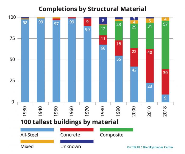 The material statistics are particularly revealing, especially when seen across time. As the chart below shows, composite structures are increasing, while all-steel towers are continuing to decrease. More than half of all completed towers in 2018 (not just 200-meters-plus) are composite structures. Though the reasons behind this increase aren't spelled out in the report, composite structures enable taller heights through such tactics as "megacolumns" of steel encased in concrete, for instance, while also allowing improved structural performance, speedier construction, and related cost reductions. Regardless of these benefits, the continued reliance upon concrete (87 percent of completed towers last year used concrete by itself or with steel) in tall building construction does not bode well for climate change, given that the material is responsible for nearly 10 percent of all CO2 emissions.
