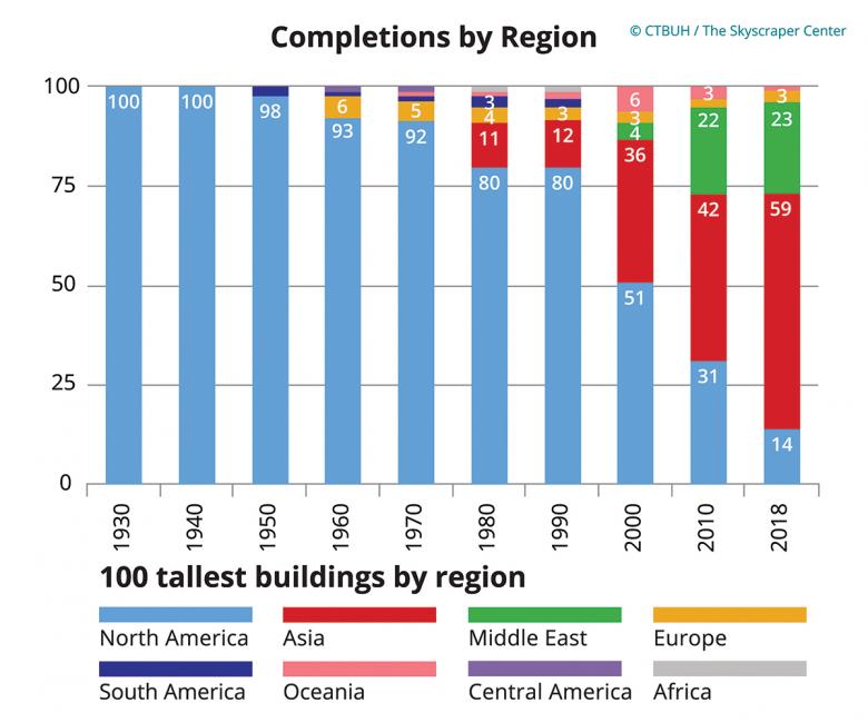 The yearly study published by the Chicago-based association, available on their Skyscraper Center website, focuses on buildings reaching more than 200 meters. Doing so puts China, with 88 completions, well ahead of second-place United States, which had only 13 completions. Accordingly, three-quarters of all 200-meter-plus towers completed last year were built in Asia. The only non-Asian city to be included in the top 18 of completions is New York City, with 8 towers; by comparison, Shenzhen, China, had the most with 14 towers. Other statistics in the report look at the functions of towers (evenly split between office, residential, and mixed-use/hotel), trends in height and other criteria over time, and the materials that towers over 200 meters are built from.