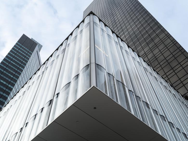 The rooftop addition is comprised of two parts, clearly seen in the photographs here: a two-story event space set back from the upper floor devoted to VIPs and private sales. The event space continues to the L-shaped roof terrace that follows the corner site and is given partial shelter by the upper floor. The most innovative part of the design is the enclosure of the VIP space; what Shigematsu describes as a “glass ‘curtain’” is made with slumped glass that “simultaneously provides high transparency and privacy, structural integrity and softness, urban presence and human-scale texture,” per a press release from OMA. Subtly, the curved profile of the glass facade echoes the limestone parapet of the 1940 building that was designed by Cross & Cross.