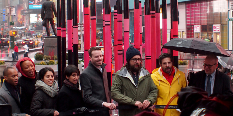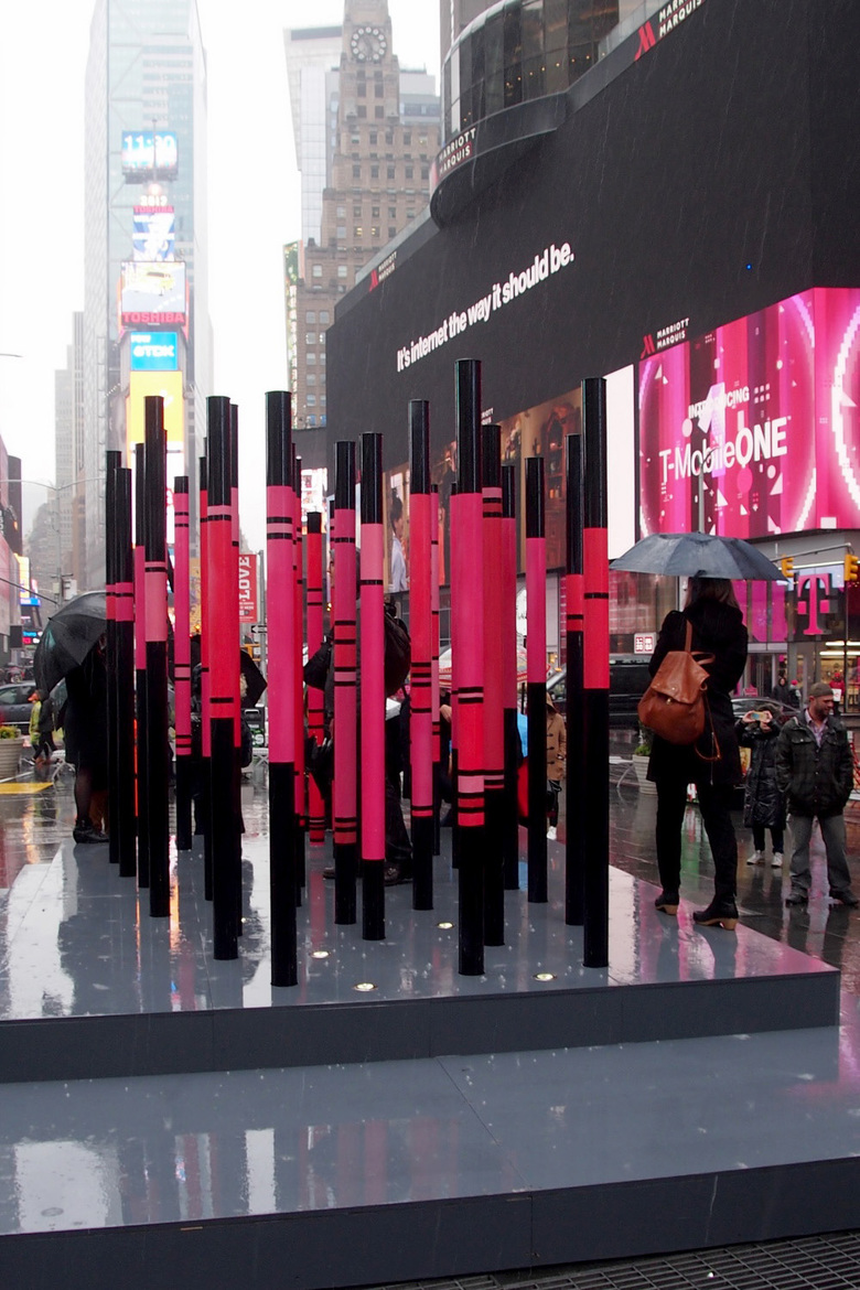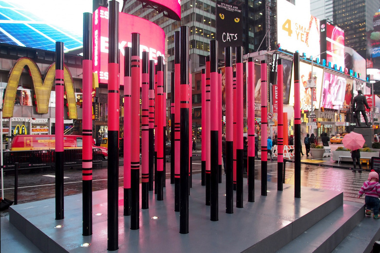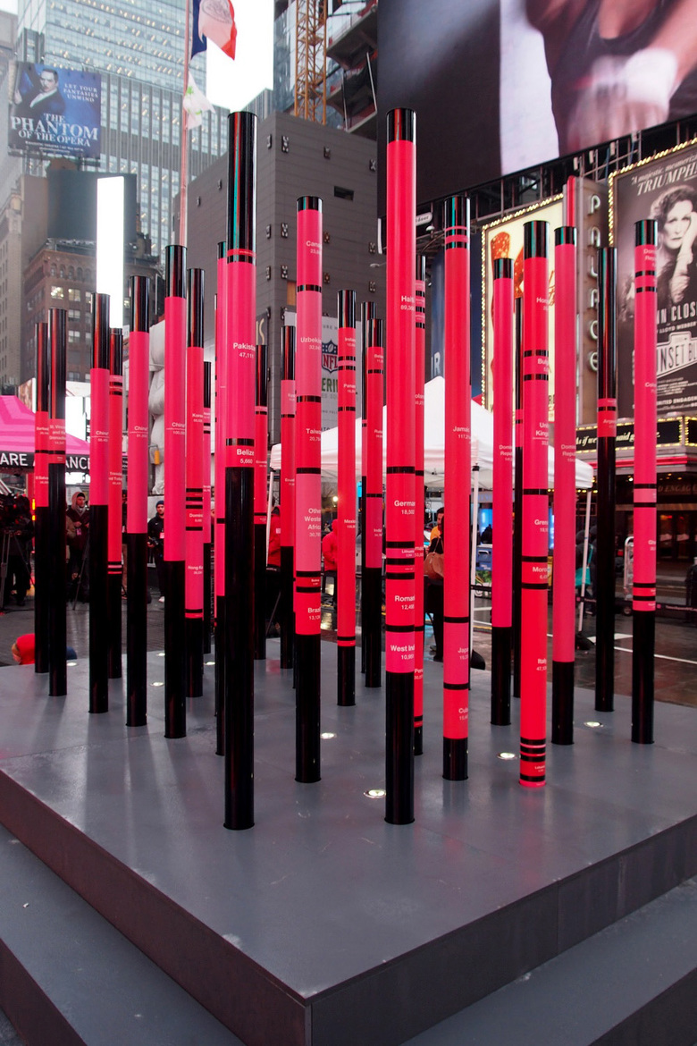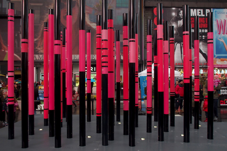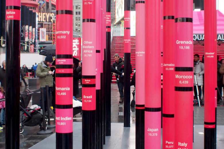 Located on Father Duffy Square, next to the TKTS steps, We Were Strangers Once Too is a layered installation that can be grasped in different ways from different points of view. Stepping onto the heart-shaped decal on the ground reveals the heart-shaped view at top, but from other angles the installation looks like a random jumble of black rods with strips of red and pink. (The photos below give a counterclockwise tour around the installation, which will be on display for approximately one month.) Up close, the painted strips of different heights reveal the names of countries with numbers, each referring to the number of immigrants living in New York City in 2015, while the shades of color indicate the growth or decline of those country's immigrants in the city from 2010 to 2015. The installation is data visualized, but with the goal of embracing diversity and loving our fellow human beings, no matter where they come from.