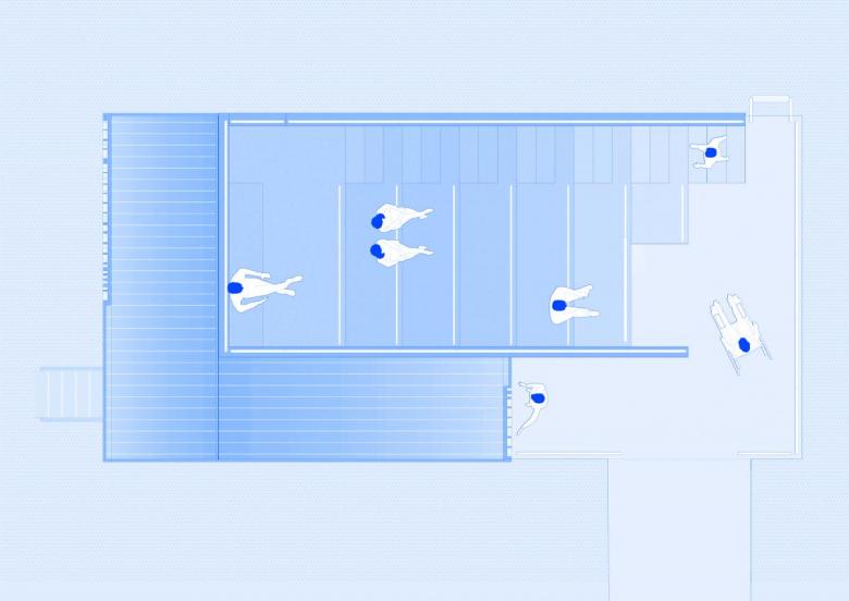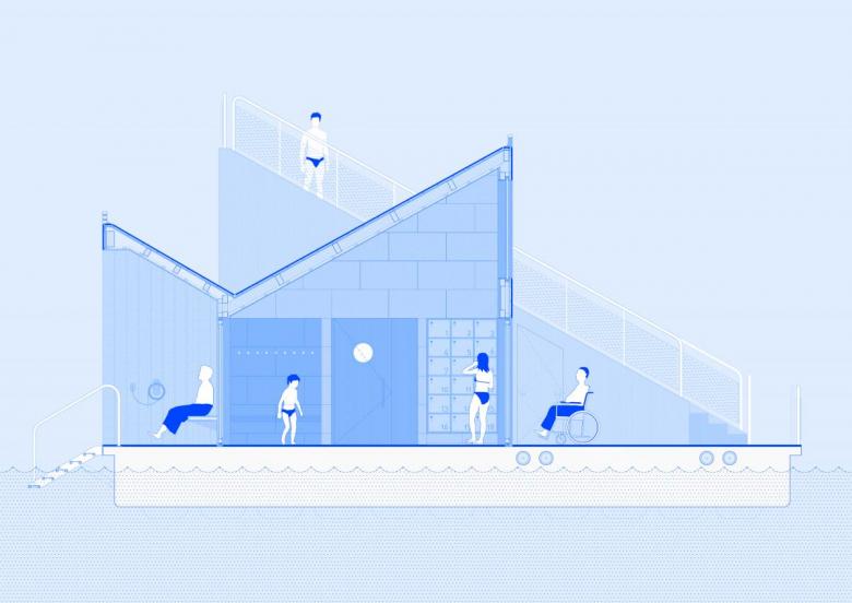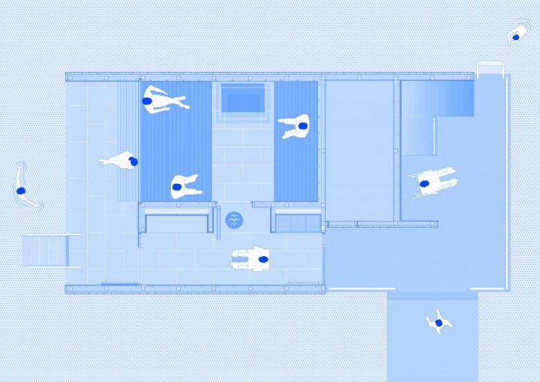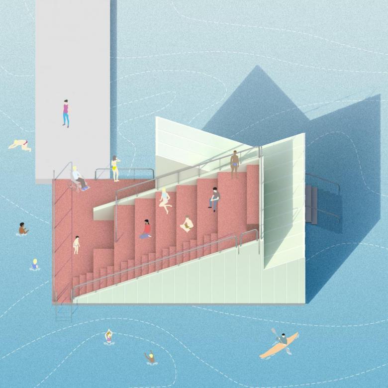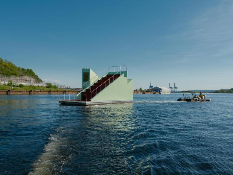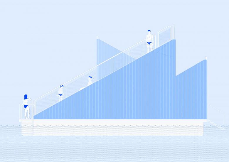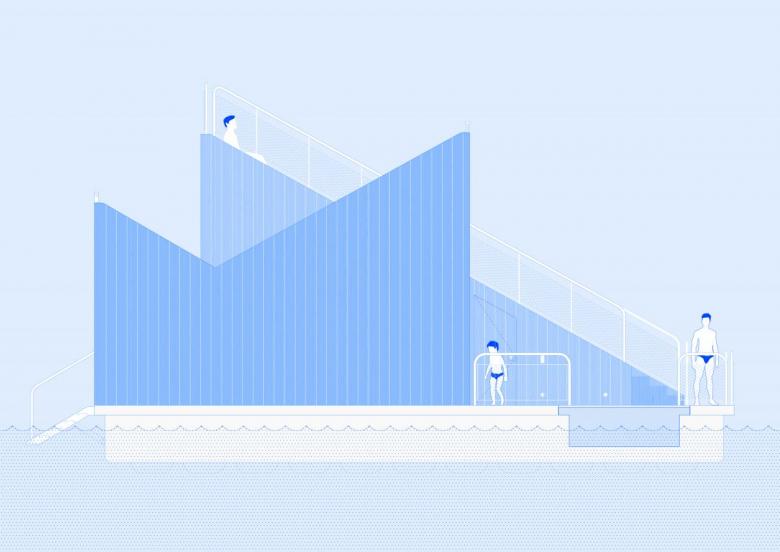 The colorful volume is named after the thrush bird that migrates annually between Spain and the Nordic countries, traditionally considered a harbinger of good luck. It is the latest in a group of floating saunas designed by various architects at the mouth of the Akerselva River. It consists of a sauna cabin with direct access to the water and an amphitheater facing the fjord that allows for the celebration of small events. The accessible pavilion uses a particular steam recirculation system that facilitates the diffusion of heat for comfort.