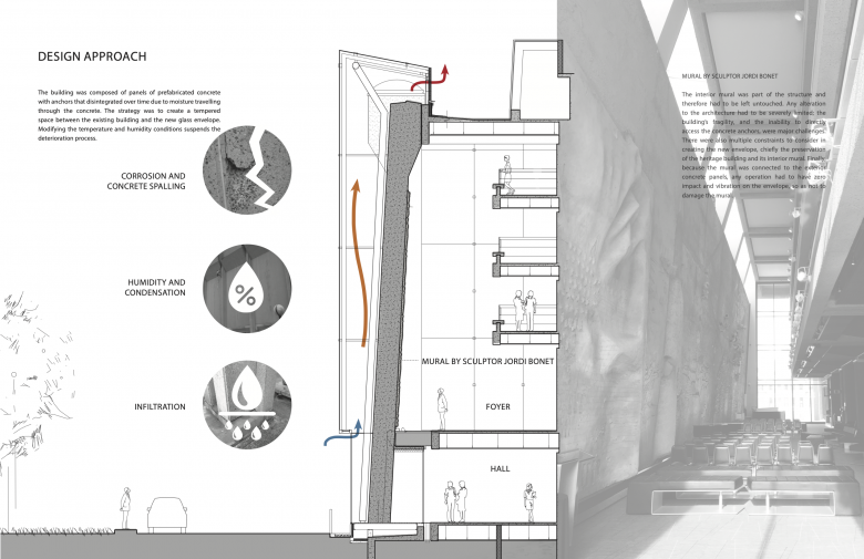"The Grand Theatre de Quebec demonstrates a host of notable innovations in the spirit of honoring the original Victor Prus building and sensitively protecting the existing degrading structure and Jordi Bonet mural. The new glass casing is quiet and understated, with a technical rigor that speaks to what must have been remarkable teamwork between the architects, engineers, and manufacturers. It skillfully addresses the challenges faced by the concrete façades and unique interior sculptural murals by developing from the exterior a meticulous envelope system and creating an in-between controlled environment. The team's choices throughout the process demonstrate how intelligent, quiet innovations can significantly extend the life of public buildings for the betterment of the community, climate, and environment."