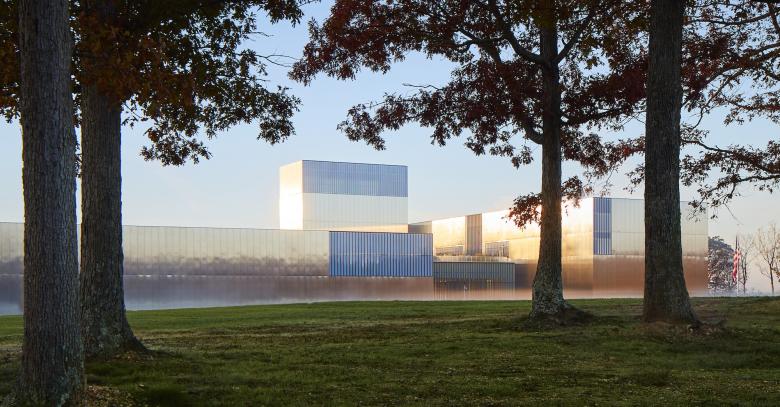 The museum, designed by Skidmore, Owings & Merrill for the US Army and the Army Historical Foundation, is located on 84 publicly accessible acres of Fort Belvoir, located about 20 miles south of Washington, DC. Although the museum is open free-of-charge for visitors, who need to reserve timed tickets and follow the usual COVID-19 precautions, the opening ceremony took place virtually, featuring a half-dozen speakers inside the museum's lobby and helicopters buzzing above the stainless steel-clad building.