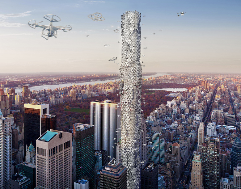 Second place has been awarded to The Hive, designed by Hadeel Ayed Mohammad, Yifeng Zhao, and Chengda Zhu from the United States. Their project "imagines a vertical control terminal for advanced flying drones that will provide personal and commercial services to residents of New York City."