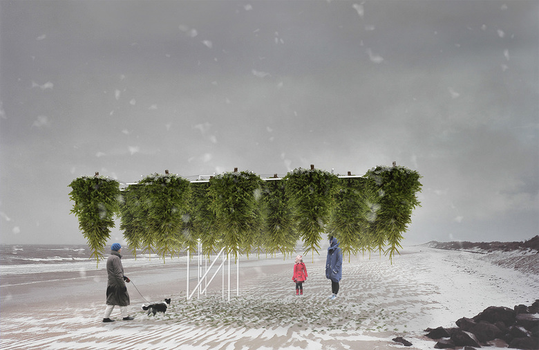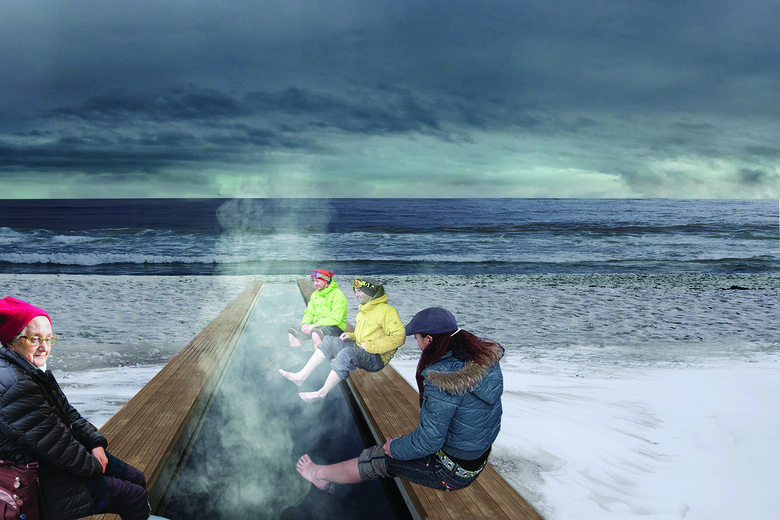 "This installation uses the idea the Japanese hot spring and warm water to provide physical relief from the cold. By creating a landscape-based gathering space on the beach, this installation emphasizes the contrast in the seasons and recalls memories of a summer beach."