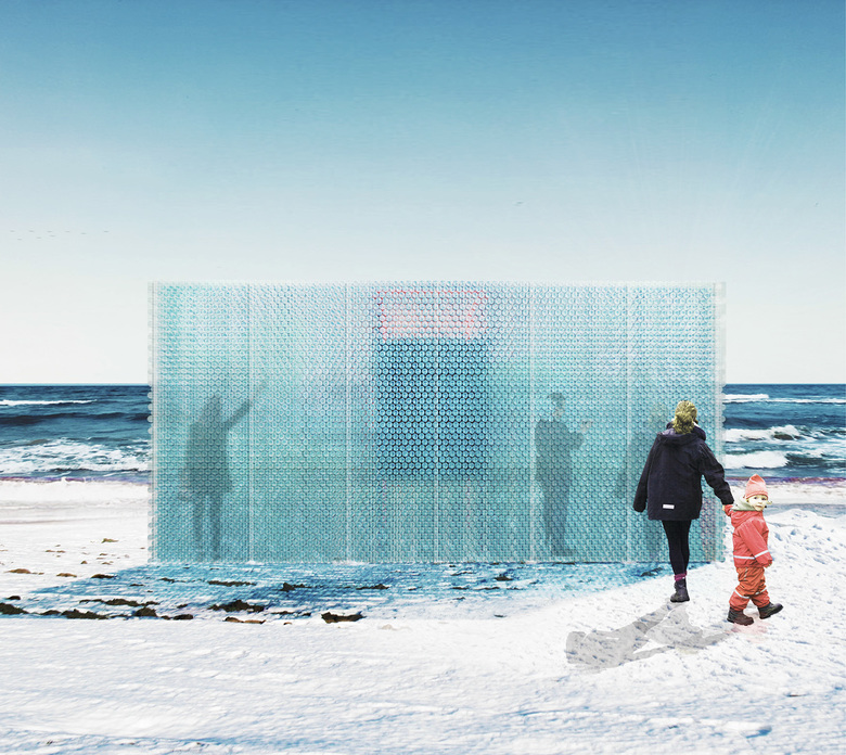 "Inspired by the statistic that by 2031 nearly one-half of the Canadian population over the age of 15 will be foreign-born or the child of a migrant parent Collective Memory aims to be the catalyst of present and shared anecdotes. Constructed out of recycled bottles – the archetype for the lost message – two translucent walls will shield the existing lifeguard structure, creating a threshold between shore and city."