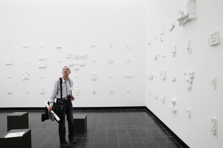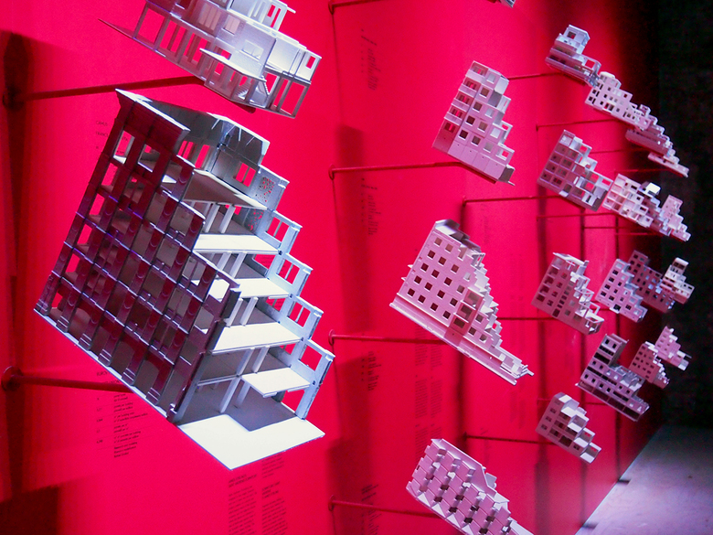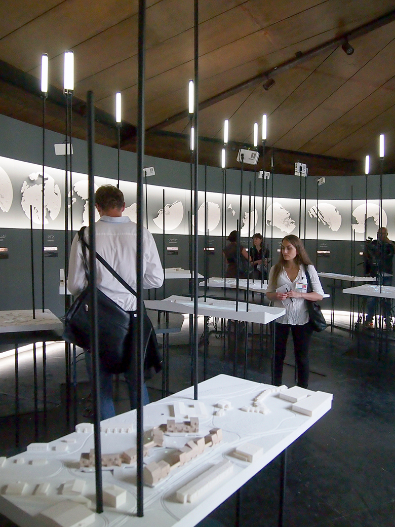 Nearly 200 1:500-scale models sprout from the walls of the Austrian Pavilion, each one depicting a parliament building in a basic white that matches the paint on the walls. Commissioned by Christian Kühn, the models allow for direct comparisons in terms of size, layout, symmetry, ornament and other architectural traits. A creative guide – closer to a swatch of paint colors than a traditional book – adds maps, site plans, and numerous demographic, economic and environmental data to the comparative mix.