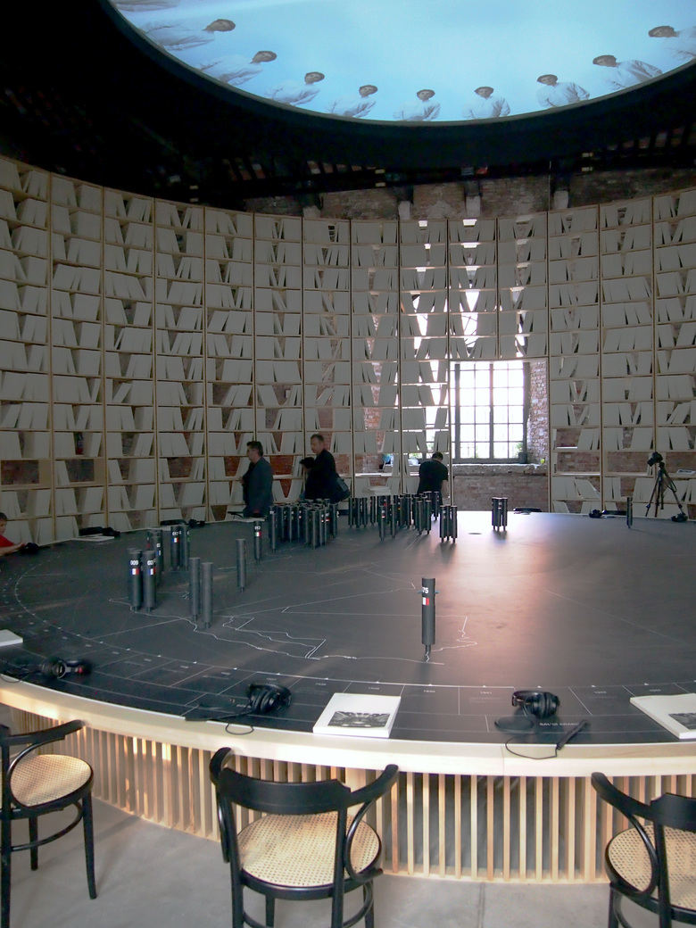 Bahrain may be a small island nation with a population of only 1.2 million, but curators George Arbid and Bernard Khoury took it upon themselves to document a selection of architecture from the Arab World (a population of more than 400 million) in the last 100 years. Their research is documented in a book that lines the circular shelves of their pavilion in the Arsenale. As visitors go home with the books the circular space will become more and more open.