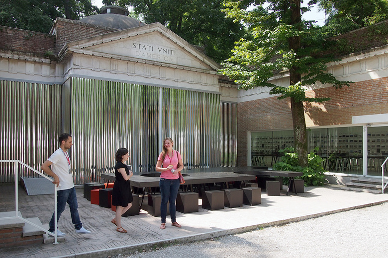 Rather than presenting architecture on American soil, the United States Pavilion, curated by Eva Franch i Gilabert, Ana Miljački, and Ashley Schafer, looks abroad to the production of American firms building overseas. Their presentation consists of two parts: a collection of research on 1,000 projects by 200 architects that lines the walls of horseshoe-shaped pavilion; and "an active, global, experimental architecture office that researches, studies, and remakes projects" from said research. The courtyard is used for discussions and other events for the six-month duration of the Biennale. Combined with the working office inside, the pavilion, like Russia's, promises to be a lively one in more than one sense of the term.