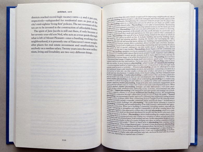 De Graaf grows the lists in this book — this book of lists — with “Data” sections prefacing some of the chapters, where he copy/pastes information, much of it in the form of lists with tiny italicized text. The page of data before the placemaking chapter, for example (see middle spread, above), lists nineteen “definitions” of the term. Definitions is in quotes because placemaking is missing from the last list: the “Dictionary of Profspeak” at the back of the book (a few terms pulled from it pepper this review). Here, de Graaf broadens the scope of his frustration well beyond the themes explored in the ten preceding chapters.