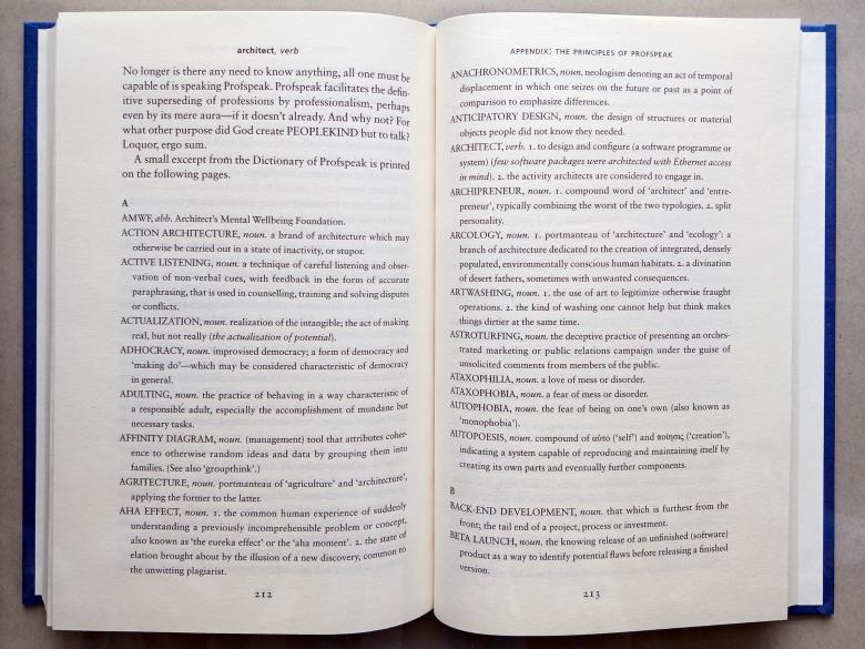 “More than a testament to jargon itself,” de Graaf writes, “Profspeak is a testament to the promiscuity of jargon.” Accurate much of the time, humorous at others, and occasionally hilarious, this dictionary that lends the book its title is quite risky. This appendix most overtly conveys, as succintly written by Jonathan Meades on the back cover, “[de Graaf's] enthusiasm for biting the hand that feeds him…” With de Graaf's — and our — internet feeds full of stories about lines in the desert and cubes the size of twenty Empire State Buildings, that bite might just be what architecture needs right now.