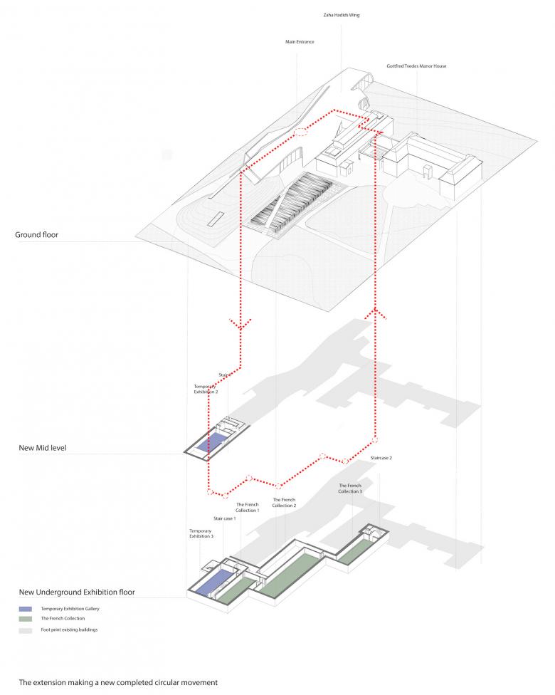 Two of five subterranean exhibition spaces create a continuation of Hadid’s exhibition spaces and are used for traveling exhibits. The continuous movement through the three main halls for the permanent collection in long, parallel, rectangular halls that are slightly offset. The steel roof only marks the outline of the central gallery. Its facets refract the light, but no daylight is admitted into the gallery below, where spot lighting enables enjoying a series of delicate pastels by Impressionist masters. Slightly less subdued is the lighting for the painting halls.