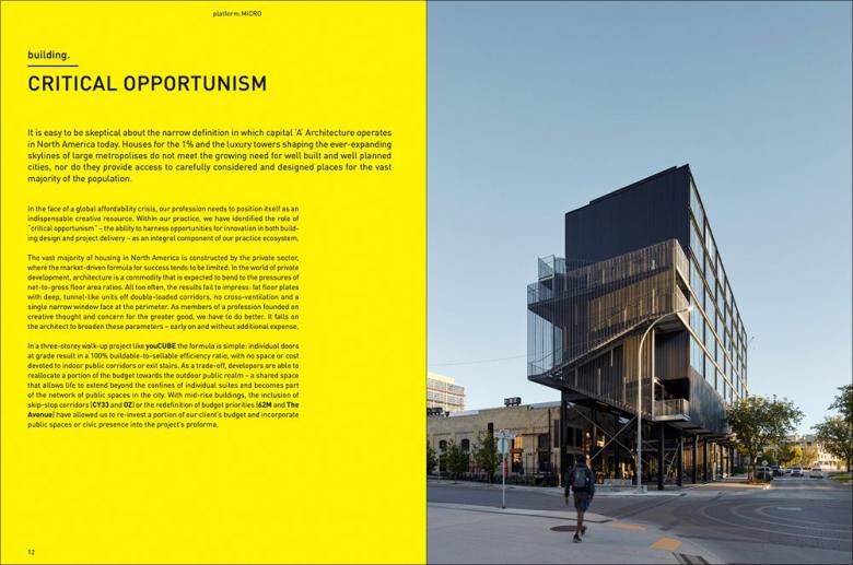 The other two volumes — platform.MICRO and platform.MODELLING — are monographic, presenting 546's work around housing in two ways. MICRO primarily offers a “toolkit” of strategies that the firm has developed since it was founded in 2007. These include the creation of in-between spaces, such as courtyards and passages, and the implementation of modularity and low-cost cladding to bring down costs. The projects in MICRO reappear in MODELLING, a presentation of twenty of 546's multi-family projects in a structured format with consistent drawings and data visualizations. These illustrations echo their sensible approaches to the finance, construction, and politics of housing, while the photographs and renderings convey their creativity and talent as architects. After all, the best housing will ultimately balance practicality and imagination.