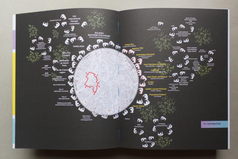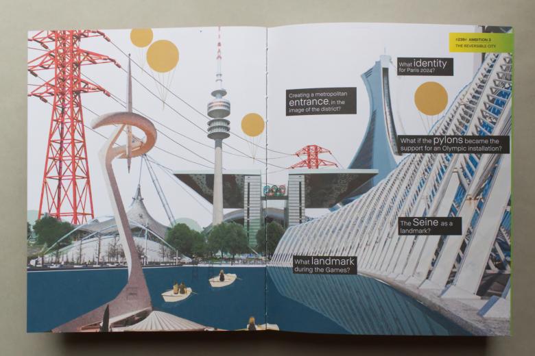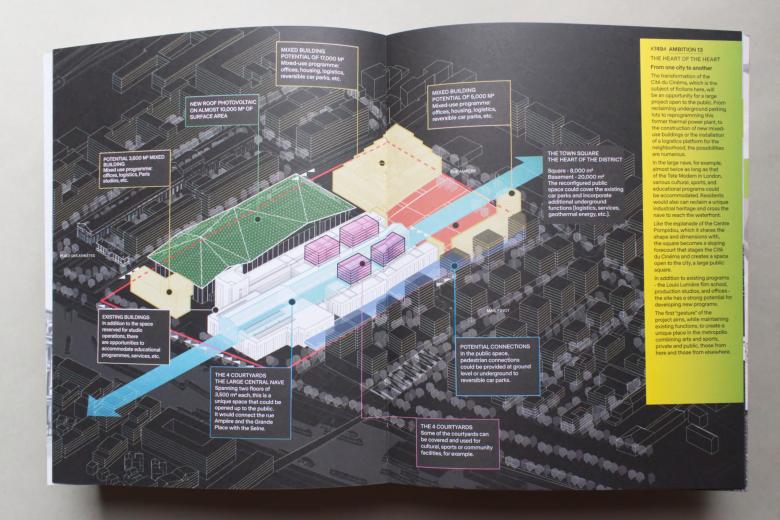 The last of the thirteen ambitions is “The Heart of the Heart,” referring to the Cité du Cinéma that sits in the center of the Olympic Village and was used as the main catering facility for athletes during the Games. With its impressive nave space, the Cité du Cinéma “will make the neighborhood shine beyond itself,” in Perrault's words. The architect therefore imaged the building serving other uses, be it a sports hall, a library, or a cinematic “nave of culture.” This 13th and last ambition elevates adaptive reuse, in line with the 95% reuse of sports complexes in Paris for the 2024 Games, but it is not the last chapter; it is followed by aerial photographs of the Olympic Village site before, during, and after construction. Two photos of the completed Olympic Village show the culmination of the 800-page manual and the many hours of hard work by all the people involved, but they also hint at the site's post-Olympic future now unfolding.