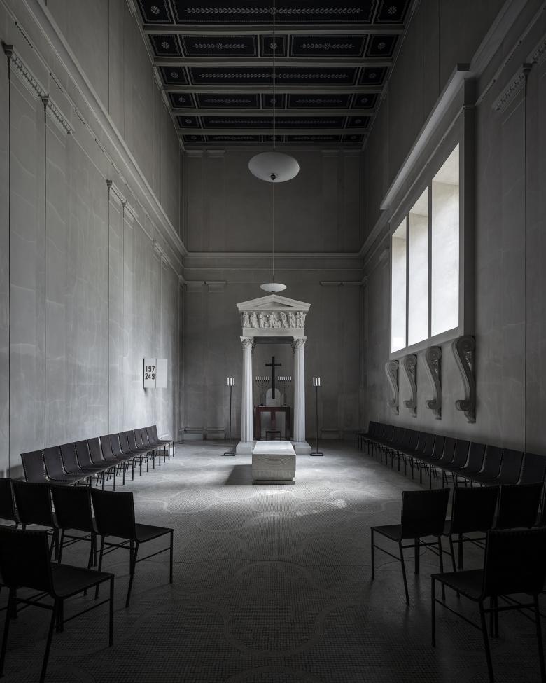 The massive National Insurance Board office building in Stockholm, built by Lewerentz in 1932, was extensively restored recently. Some interiors were recreated in detail, and furniture and clocks were painstakingly restored — an impressive expression of the new appreciation for Lewerentz’s work, which refused to be classified into stylistic categories and largely was without precedent. Lewerentz was neither a pure classicist as a young man, nor a pure modernist as an older man. His magnum opus, Skogskyrkogården (The Woodland Cemetery, designed together with Gunnar Asplund) in Stockholm, on which Lewerrentz worked for decades, is now a UNESCO World Heritage Site. In a largely agnostic country like Sweden, the design of the landscapes and buildings offers precious space for reflection. Lewerentz’s work thus stands for “a symbolic connection between life and death,” in the words of Demetri Porphyrios, an architect passionate about classical architecture. The Resurrection Chapel at Woodland was, he continues, “an expression of a critical tension with classical architecture.” This tension remained unresolved throughout his life; the juxtaposition of classicism, Christianity, and social democracy was permanent.